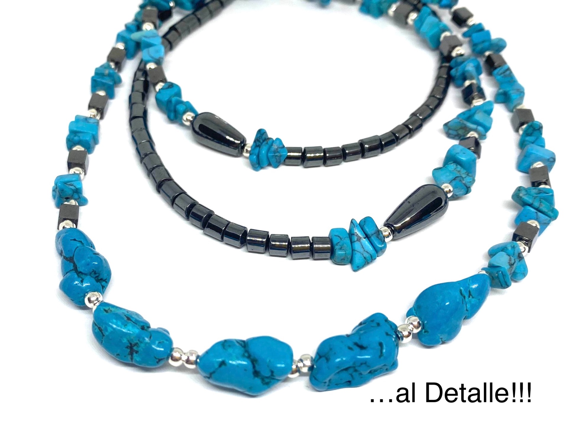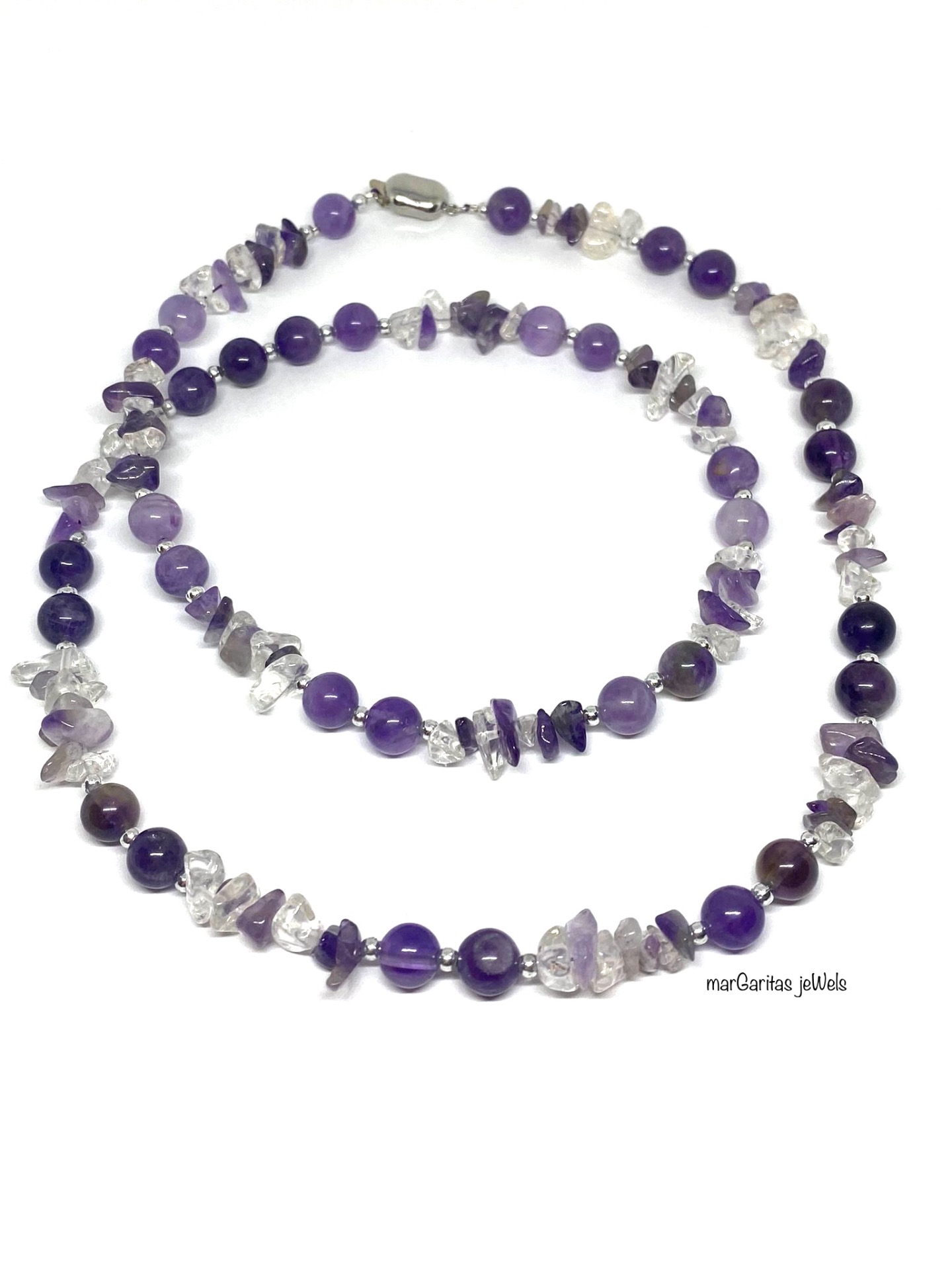 Collar largo de Bisutería Única con piedras semipreciosas (Amatista, Olivino, Ópalo y Cristal Roca) y Perlas de rio con cierre de metal. Montaje enfilado en cable de acero.