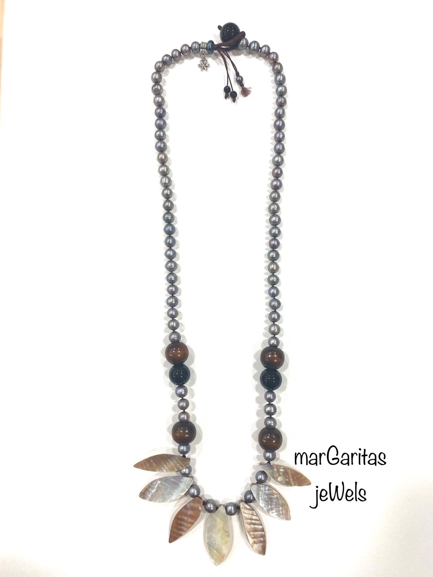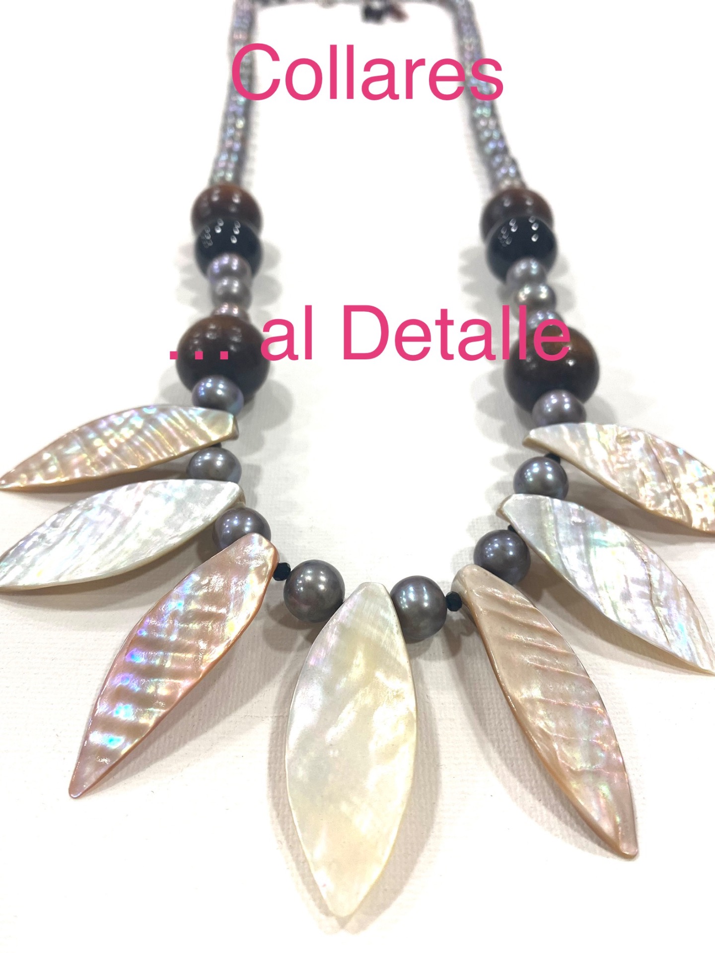 Piedras: Perla de rio gris, plumas de Nácar, Ónix y madera Ébano
