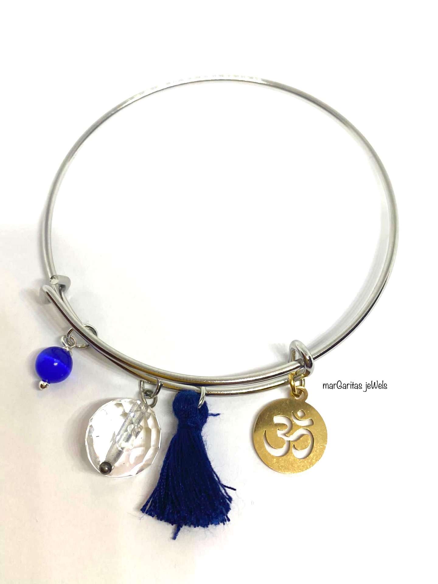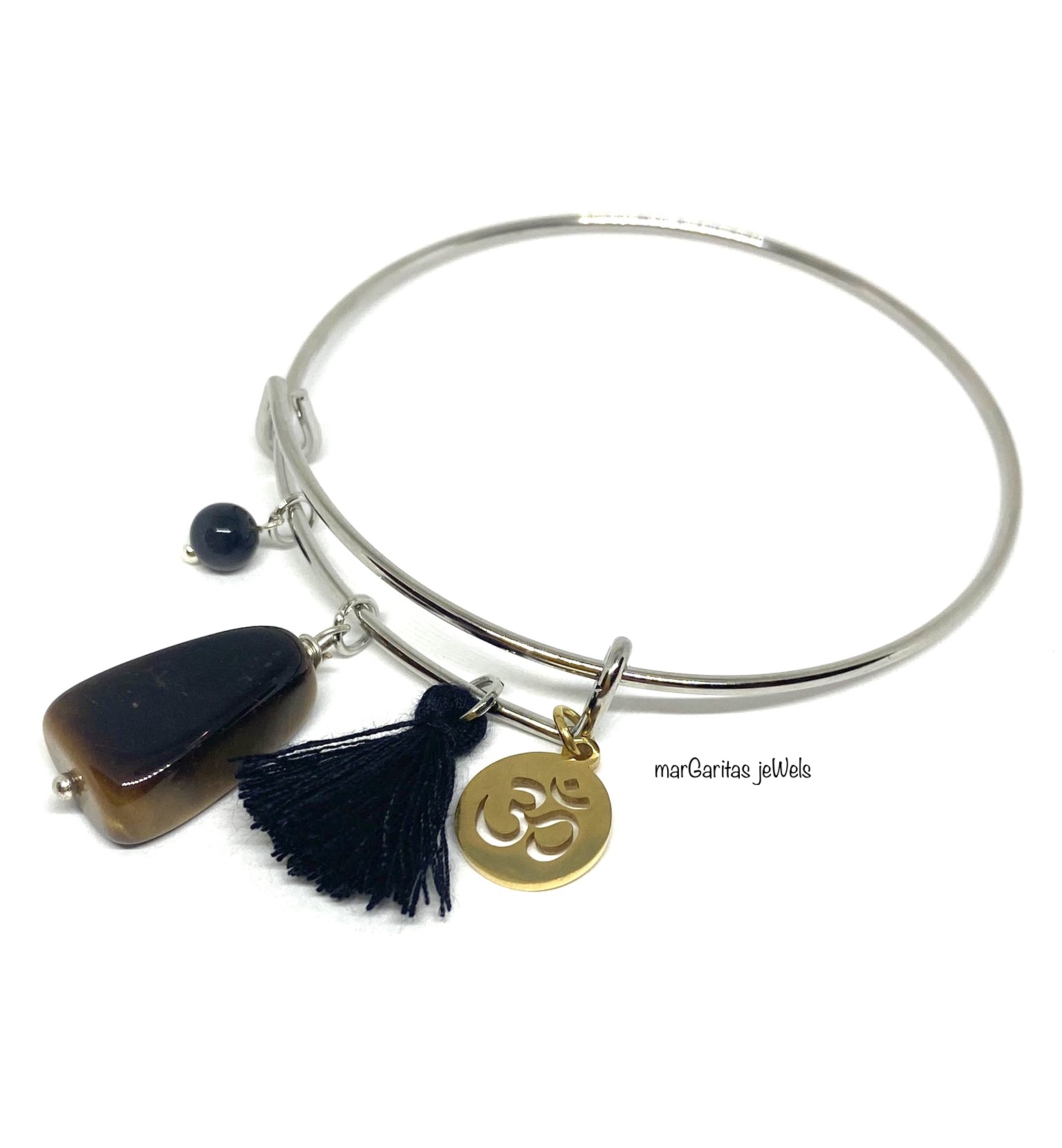Pulsera Única by Marga de acero con colgante OM de acero dorado, piedra natural y bolita ojo de Gato con borla de hilo. Medida única. Cierre flexible.
