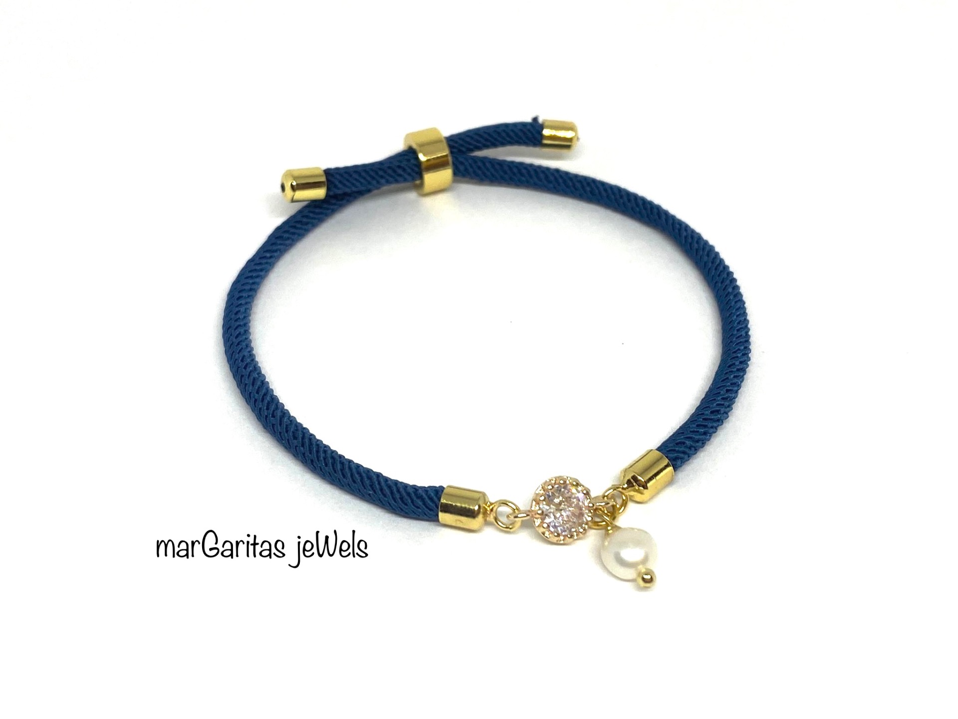Pulsera de bisutería con cuerda color rojo o azul marino y montada a mano con colgante de perlita de rio natural y hecha a mano por Marga. Montaje en cuerda con cierre ajustable. Medida ajustable. Elige el color dejando un comentario en el pedido.