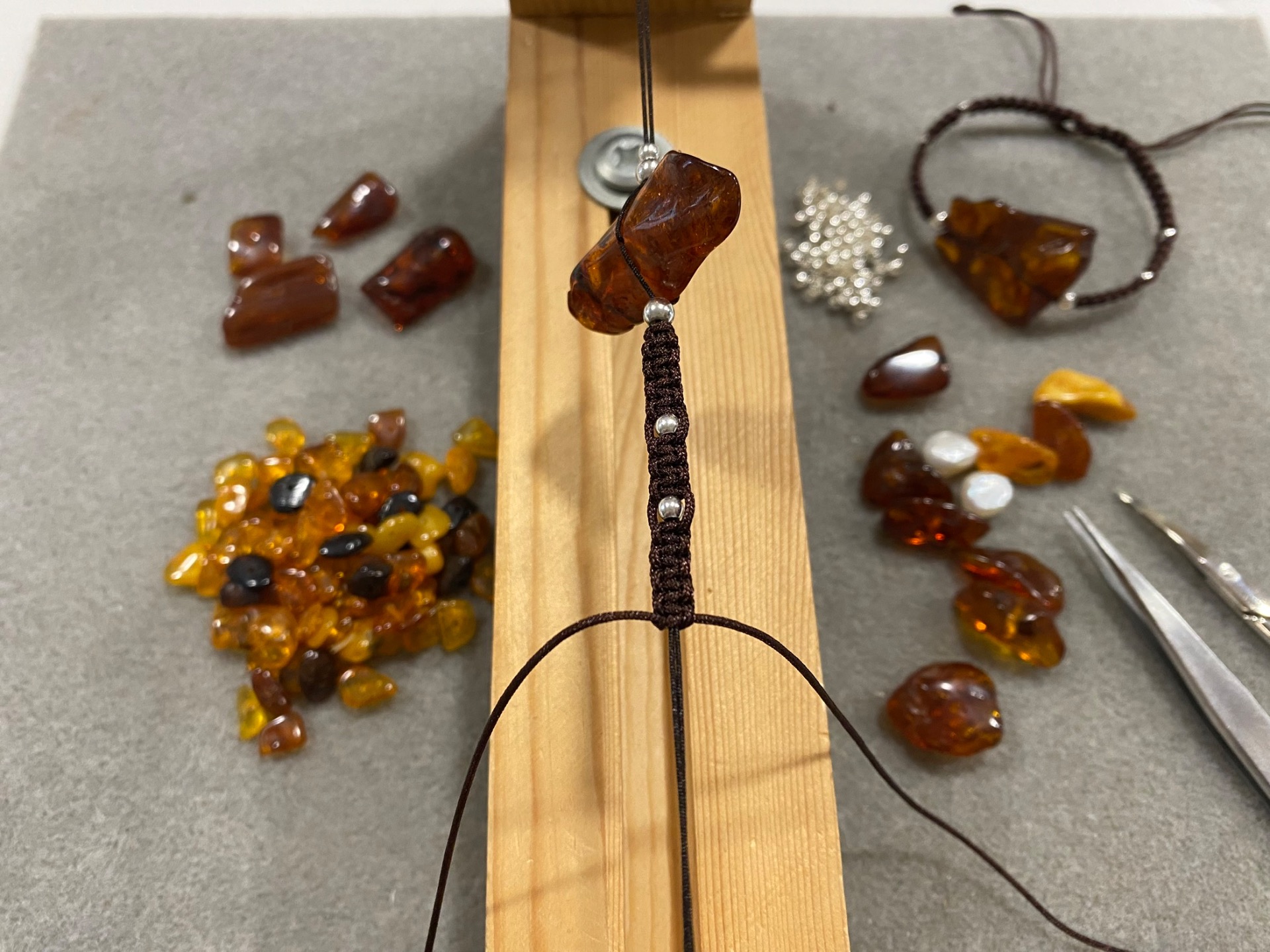 Pulsera única de piedra naturales con Ámbar Báltico, hecha a mano con macramé artesanal color chocolate y plata 925.