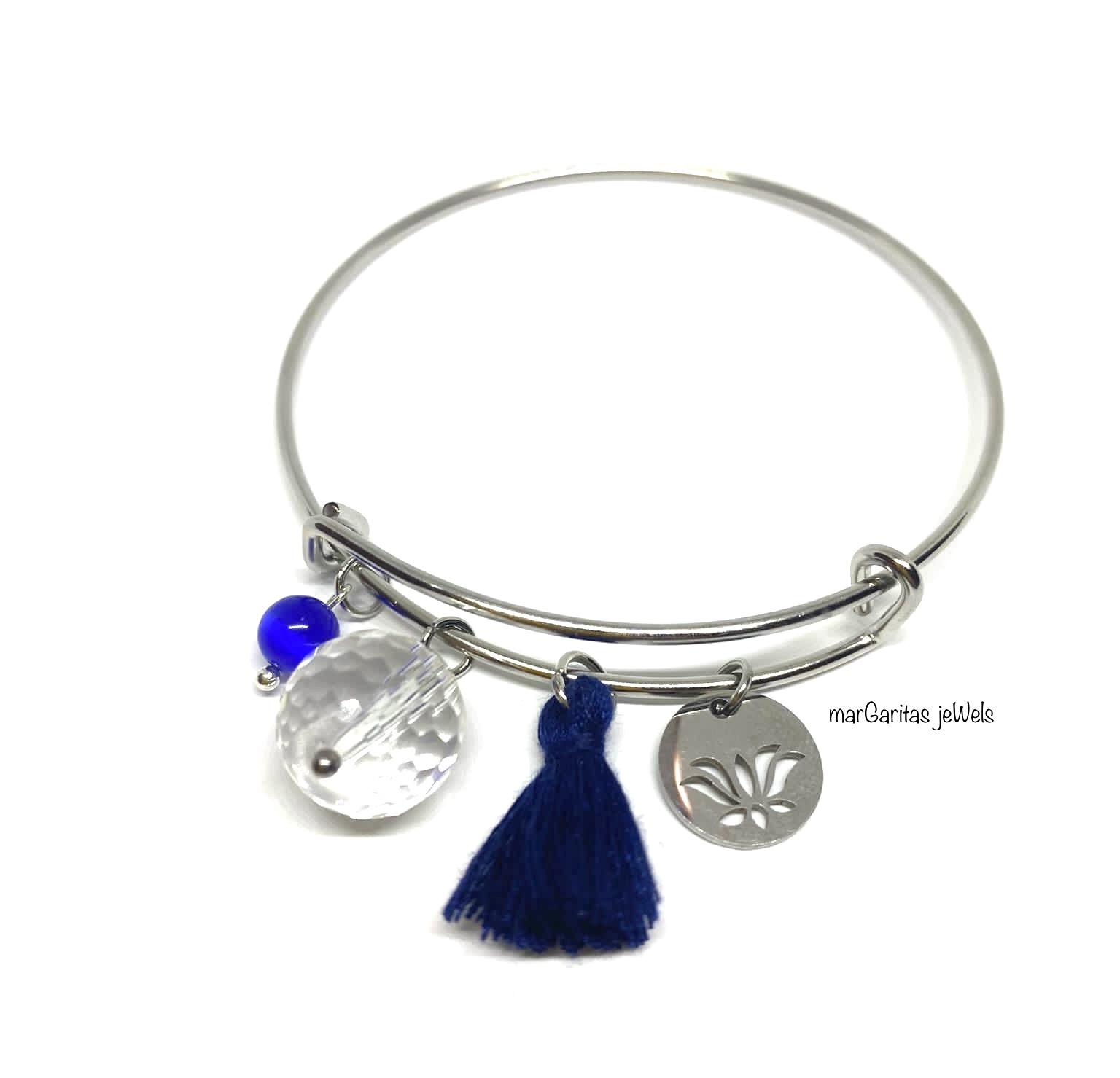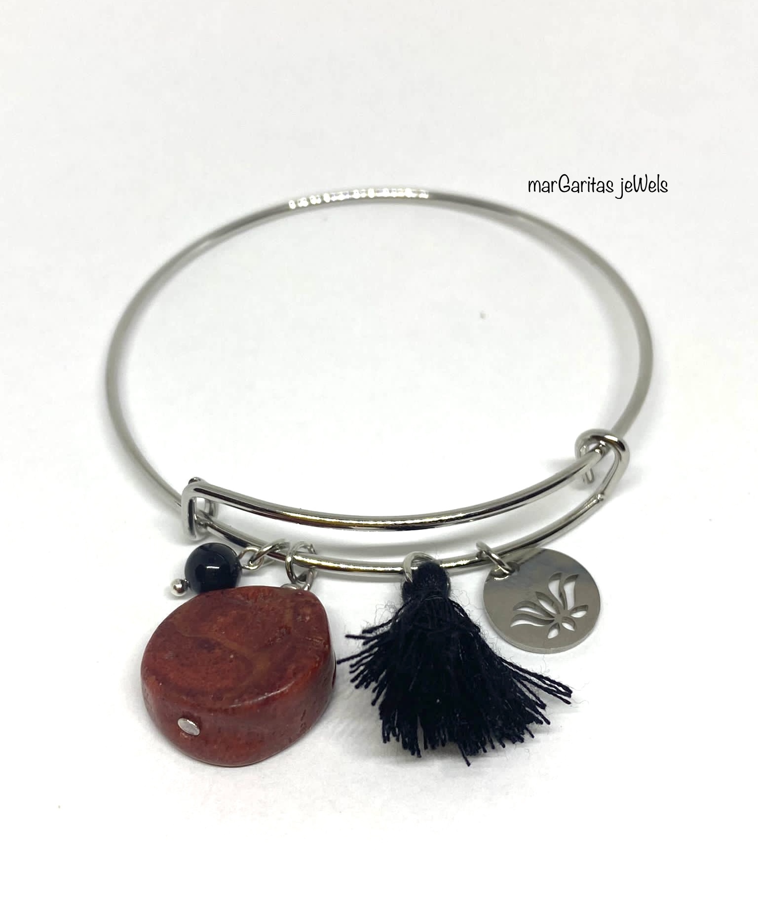 Pulsera Única by Marga de acero con colgante flor de Loto de acero, piedra natural y bolita ojo de Gato con borla de hilo. Medida única. Cierre flexible.Elige el color dejando un comentario en el pedido.